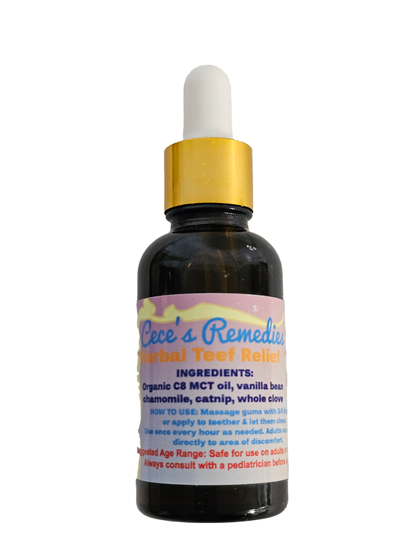 Ease teething and toothache discomfort naturally with Herbal Teef Relief, a soothing infusion designed for all ages. Made with a base of pure C8 MCT oil for smooth, rapid absorption, this formula carries the comforting properties of whole clove, chamomile, catnip tea, vanilla bean, and turmeric. Each herb was chosen for its gentle, time-honored role in calming oral discomfort while nourishing delicate tissues.