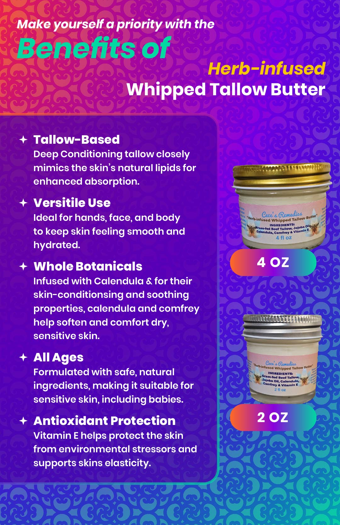 Grass-Fed Beef Tallow, Organic Jojoba Oil (infused with Calendula & Comfrey), Pure Organic Vitamin E.